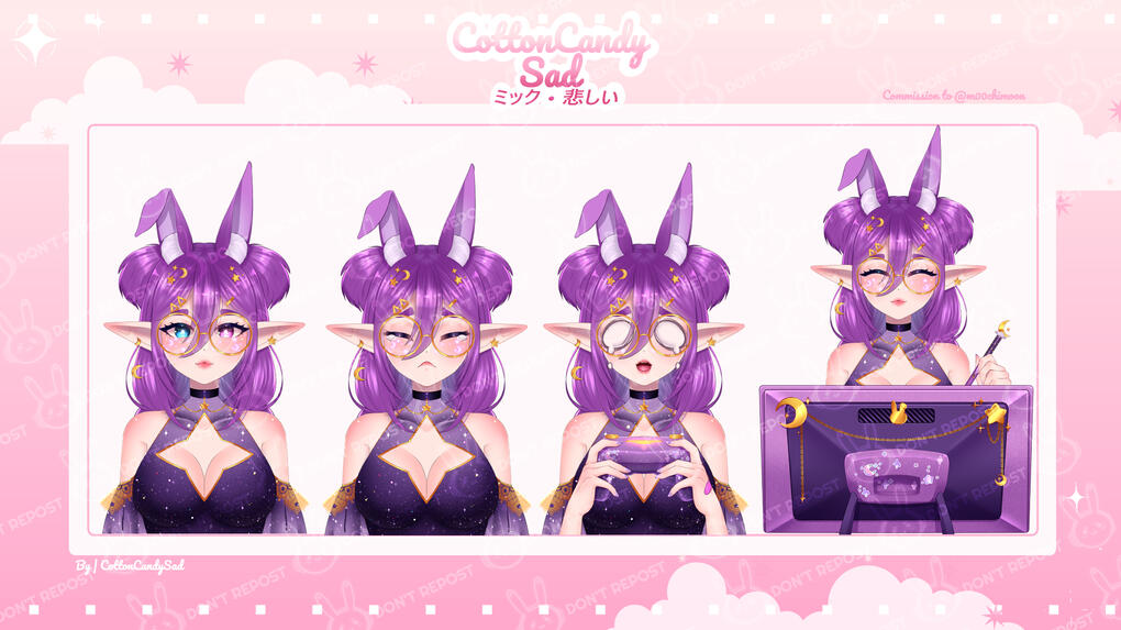 Vem com a expressão base de sua escolha + uma expressão extra grátis que você quiser (e sim, pra quem usa o veadotube agora o seu png pode piscar e isso vem incluso)